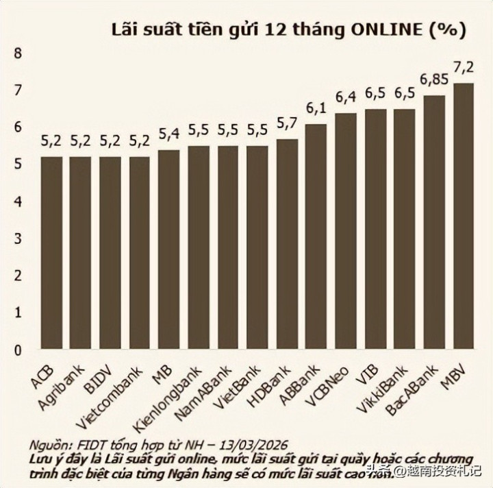 越南各大银行12个月期线上进款利率(%) 图源:FIDT凭据各银行数据整理(2026.3.13)