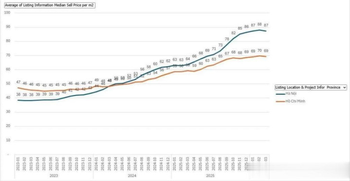 胡志明市(黄)与河内市(蓝)的房地产价钱走势变化 图源:Batdongsan.com